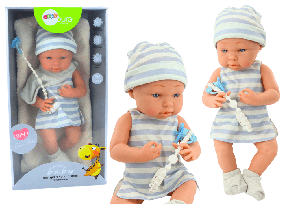 Esta adorable muñeca viene vestida con un conjunto en tonos azul y blanco, acompañado de un babero, gorrito, calcetines y un chupete sujeto con una cuerda, lo que aumenta su realismo y permite a los niños recrear diferentes escenarios de juego. Además, incluye una manta suave, ideal para arroparla y hacer que el juego sea aún más envolvente.