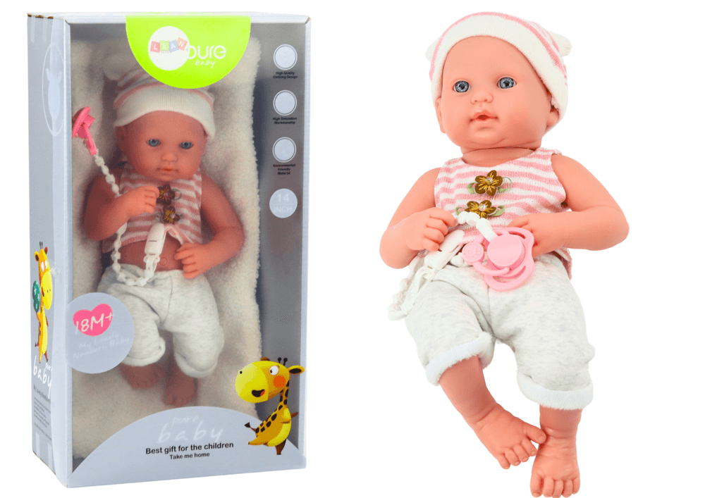 Incluye un chupete sujeto con una cuerda y una manta suave, lo que añade realismo al juego y permite recrear momentos de cuidado y afecto. Fabricada con materiales seguros y certificados, esta muñeca cumple con las normativas CE y EN71, asegurando una experiencia de juego segura para niños a partir de 18 meses.