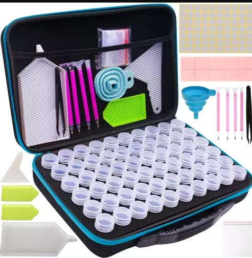 MUCHOS ELEMENTOS INCLUIDOS: el kit de bordado de diamantes incluye una gran cantidad de elementos que harán que pegar cuadros de diamantes sea mucho más conveniente y práctico. El conjunto incluye accesorios como: estuche, 60 frascos, 10 cuadrados de pegamento, 3 recipientes de diferentes tamaños, embudo de silicona plegable, 4 bolígrafos de diferentes tamaños, pinzas, bolsas de cuerda, 1 espátula para alinear las líneas.