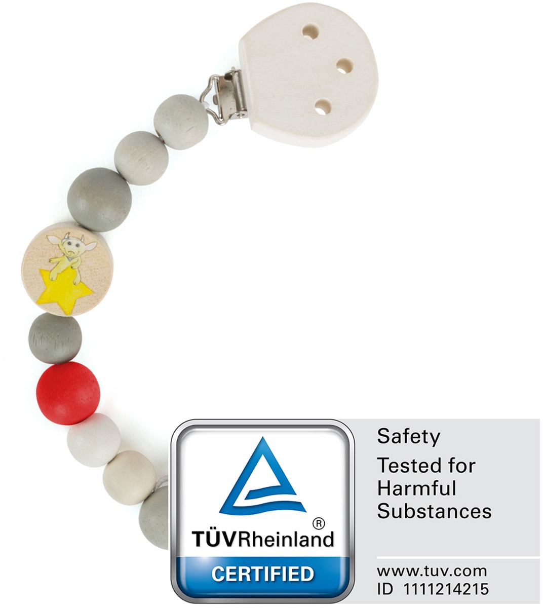 Esta cadena para chupete tiene un precioso diseño de una cabritilla llamada Ludwig. Está fabricada cumpliendo la norma TuvRheinland que certifica que está libre de todo tipo de sustancías nocivas para el bebé. Incluye clip muy fuerte para una sujeción perfecta.
