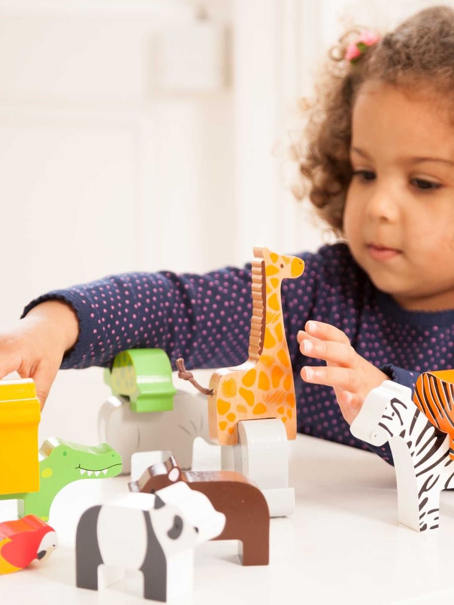 ¡A tu hijo le encantará apilar estos dulces animales de madera, creando coloridas torres para derribar nuevamente! Encontrarán un cocodrilo, una jirafa, un tigre y muchas más de sus criaturas favoritas, lo que les dará mucho de qué charlar.
