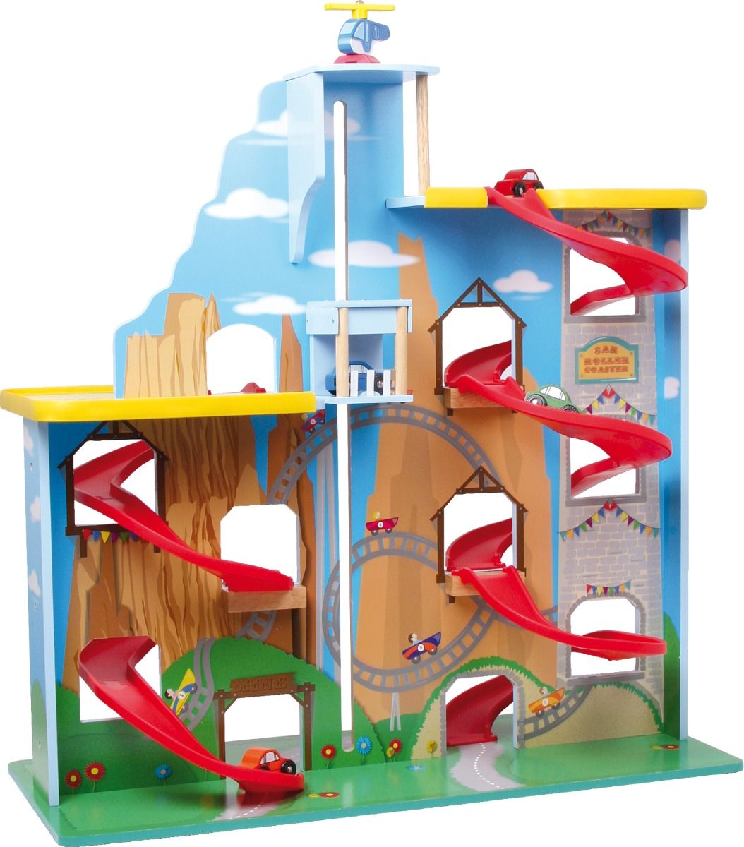 ¡Atención, amantes de los coches! El aparcamiento extra alto de varios pisos, hecho de paneles especialmente resistentes, permite que los coches circulen por diferentes niveles o que un ascensor los eleve.