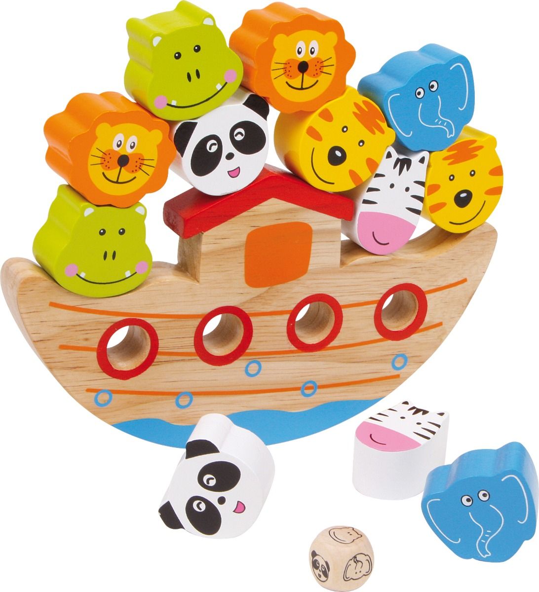 En este juego, se debe tratar poner todas las parejas de animalitos en el arca, ¡Sin que esta pierda el equilibrio! Para hacerlo aún más interesante, será un dado el que decidirá qué animales deben subir conjuntamente al arca. Con este juego, niños y adultos entrenarán la paciencia y la destreza para que ningún pasajero se caiga del arca.