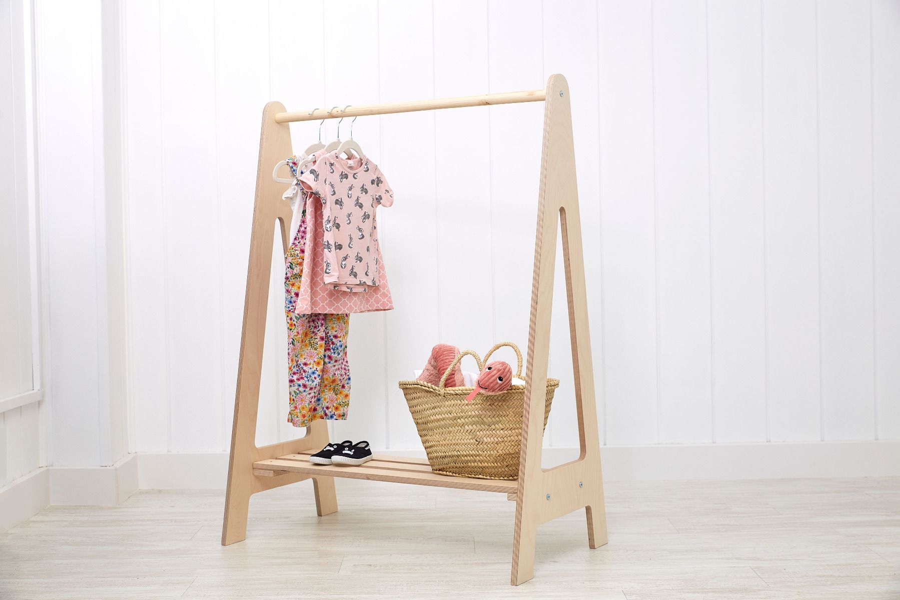 El armario burrito de MOBO hace la función de perchero y zapatero. Cuenta con una barra circular en la parte superior donde colgar las perchas con la ropa de los peques. Además cuenta con una balsa inferior donde se pueden colocar los zapatos o cajas con diferentes accesorios, es un mueble estable y seguro para cualquier dormitorio infantil.