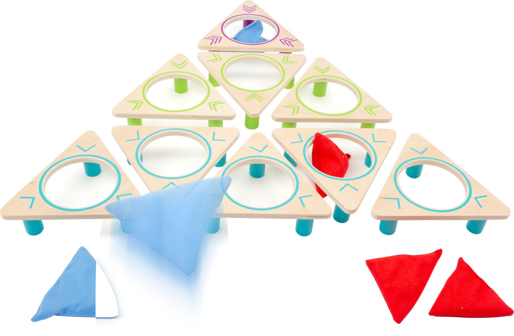 ¡Aquí, se requiere puntería! El objetivo de este juego de lanzamiento de madera FSC® 100% certificada, es encajar las las bolsas de colores en los orificios de diferentes colores. Cada color representan una puntuación.