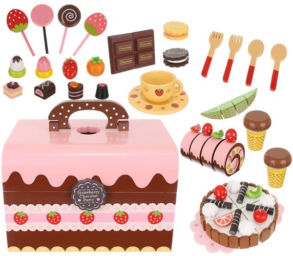 - Caja de dulces – una bonita caja decorada con un conjunto de accesorios que deleitarán a cualquier pequeño chef. Hecho de madera de alta calidad con especial atención al detalle. Contiene cubiertos y postres de aspecto delicioso, por ejemplo, pasteles, helados, bombones, piruletas o galletas. Todo lo que necesitas para hacer una gran fiesta. Seguro que le dará a tu hijo muchas horas de diversión.
