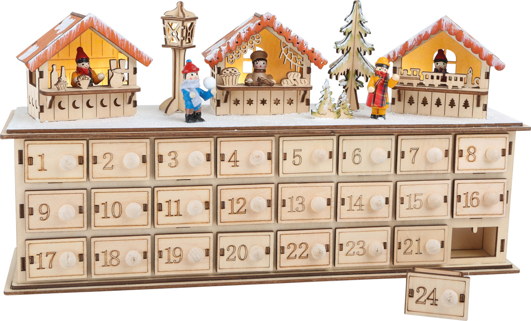 Las cabañitas están trabajadas en filigrana y están en medio de una brillante decoración con nieve. Aquí se venden pasteles, juguetes y brezels, que se presentan con mucho detalle. Cuando oscurece se pueden encender la luces de las cabañas y del farol.
