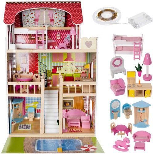 ESPECIFICACIÓN - color: multicolor; material: madera; número de elementos en el conjunto: 15 + casa; dimensiones (largo/ancho/alto): 29/59/90cm; número de niveles: 3; número de habitaciones: 5 + balcón; peso: 10 kg; peso en el paquete: 11,25 kg