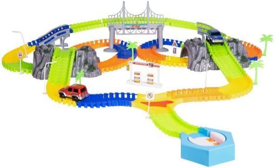FLEXIBLE: las partes de la pista son flexibles, puede organizarlas libremente: las posibilidades son infinitas, ¡el diseño de la pista y la dirección de viaje se pueden cambiar incluso mientras conduce! El set incluye 3 puentes, por lo que el niño también puede construir colinas o túneles. La pista está recortada, por lo que es fácil de plegar y configurar, el niño puede organizar uno largo o varios más pequeños, p. bucles