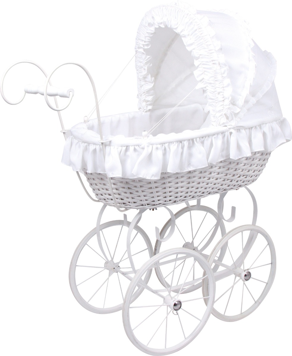 Este cochecito barnizado en blanco brillante, con bastidor de metal y ratán tejido es un verdadero complemento para las muñecas.