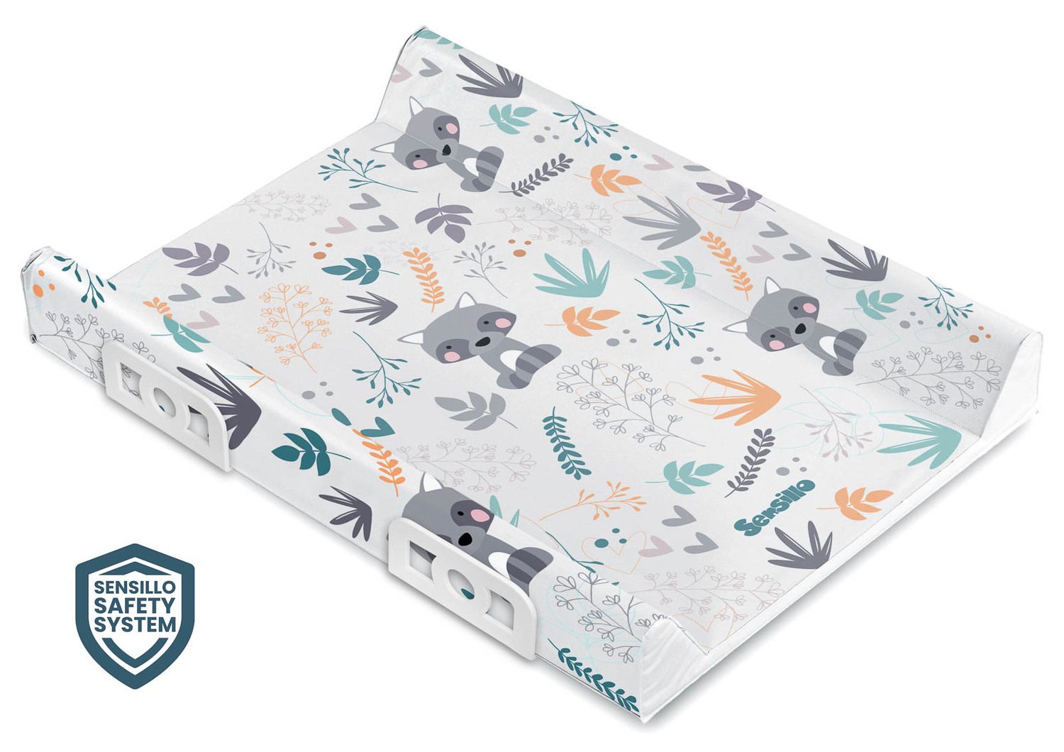 La colchoneta para cambio de pañales Sensillo con alegres estampados ha sido diseñada para brindar un cuidado cómodo a los más pequeños. Las patas incluidas en el conjunto permiten una instalación segura y estable directamente en una cuna de 60 cm de ancho. La mesa para cambiar pañales también se puede montar en una cómoda u otra superficie estable. La mesa para cambiar pañales se distingue por el innovador Sistema de Seguridad Sensillo, que evita que el niño se caiga gracias a refuerzos laterales adicionales. Para la producción, se utilizaron materiales de la más alta calidad que garantizan la máxima seguridad y comodidad de uso. El aceitado en la mesa para cambiar pañales Sensillo es completamente seguro para la salud del bebé, ya que no contiene ftalatos, metales pesados y otras sustancias dañinas.