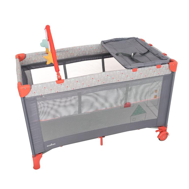 Esta preciosa cuna de viaje de la marca Olmitos incluye cambiador así como barra de juguetes para entretener al bebé mientras duerme o lo cambias.