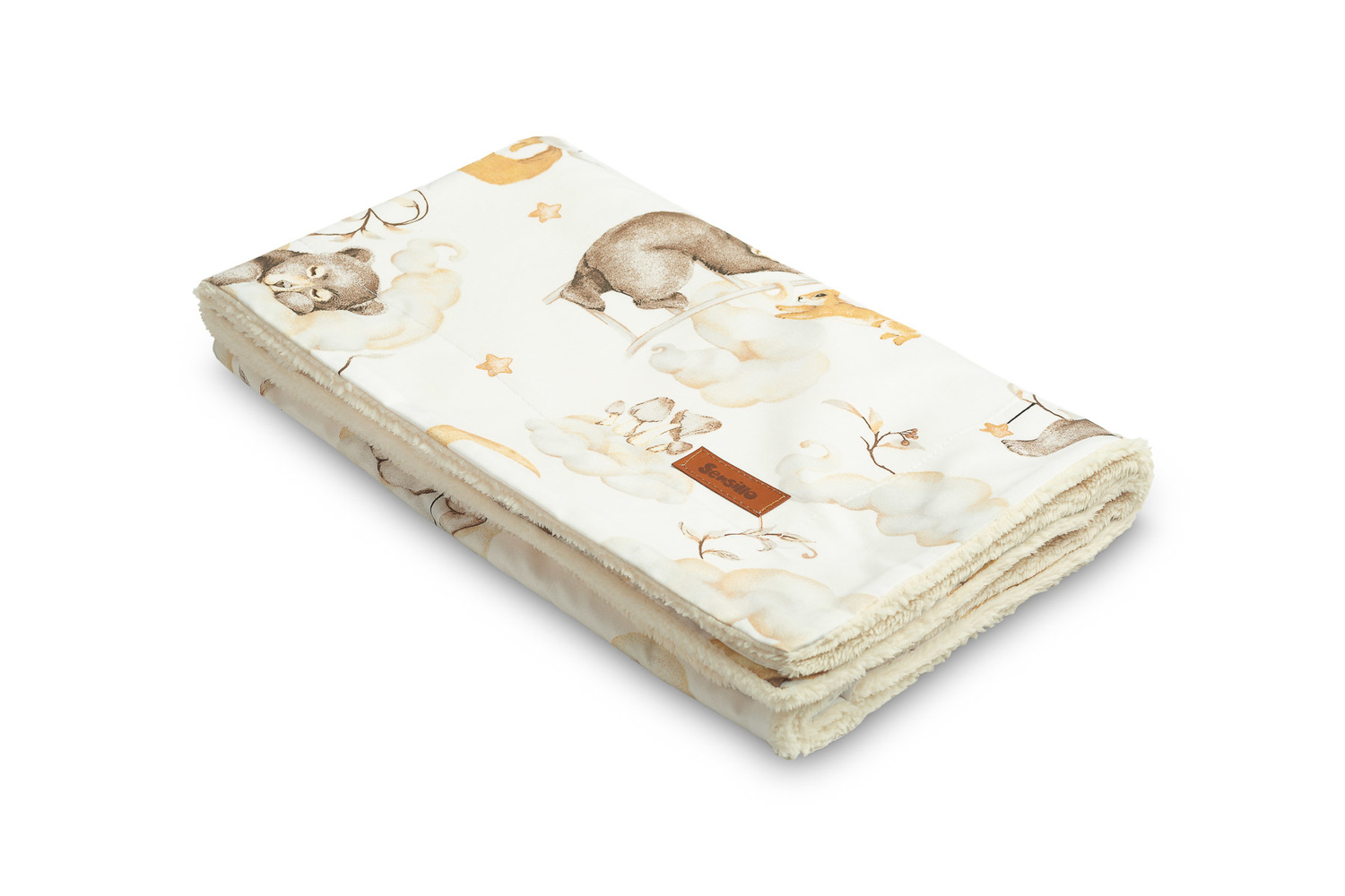 La Manta Plush Dream es una solución acogedora para los paseos de primavera y otoño con tu bebé. Confeccionada con una mezcla de felpa suave y algodón 100%, proporciona calor y suavidad en los días fríos. Su diseño reversible ofrece versatilidad y estilo, adaptándose a tus preferencias.