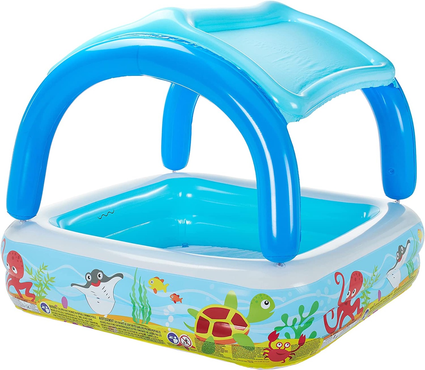 Esta piscina inflable con un diseño de fondo marino y un parasol para proteger a los niños de los rayos del sol parece ser una buena opción para aquellos que buscan una forma segura y divertida de que los más pequeños de la casa disfruten del agua.