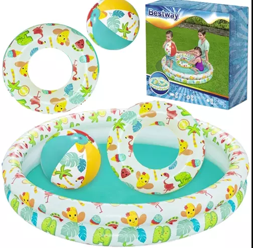 ESPECIFICACIONES - material: vinilo; color: multicolor; forma: redonda; edad: 2+; tipo: inflable; dimensiones de la piscina (ancho/alto): 122/20 cm; diámetro de la pelota: 27 cm; diámetro del círculo: 46 cm; peso en el paquete: 0,85 kg