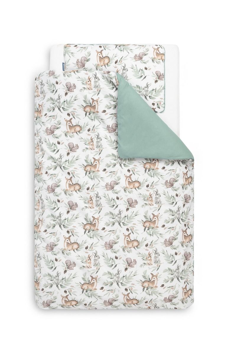 El diseño Ciervos menta con sus colores blancos y menta crea una atmósfera tranquila y relajante en la habitación infantil. Los colores suaves y el estampado elegante hacen de este conjunto una adición hermosa y serena para cualquier decoración de habitación de niños. Además, las esquinas redondeadas del edredón y la almohada añaden un detalle de diseño seguro y atractivo, esencial en el entorno de un niño.