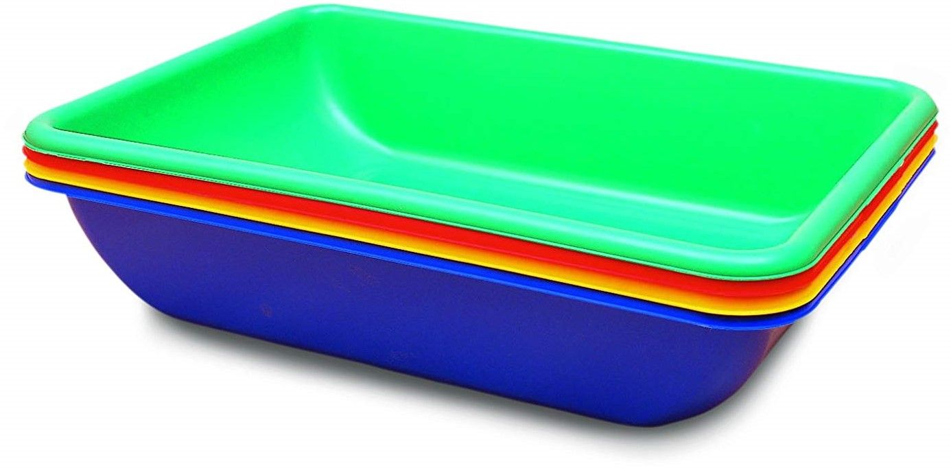 Este set incluye 4 robustas bañeras o tinas de actividades para jugar con agua y arena. Las puedes usar tanto en interiores como en exteriores y los colores son al azar.