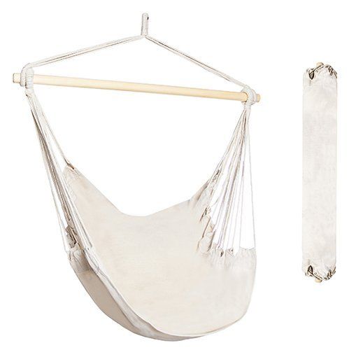 MATERIALES NATURALES: proporciona una ventilación adecuada, lo que mantiene la comodidad de usar una silla colgante incluso en días calurosos. La rueda de montaje de metal sólido se combina con cuerdas duraderas, distribuidas uniformemente sobre el ancho de la hamaca a través de una barra transversal de madera. Este diseño hace que todo sea fácil de colgar y, además, la hamaca se proporciona bien equilibrada y estable.