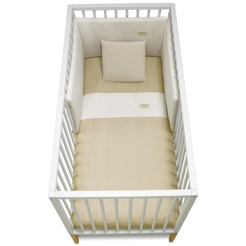 Este juego de cuna de 2 piezas está compuesto por una colcha y un protector de cuna. Pertenece a la colección Vichy10 de Cambrass y está disponible en color beige, gris, rosa y azul claro.