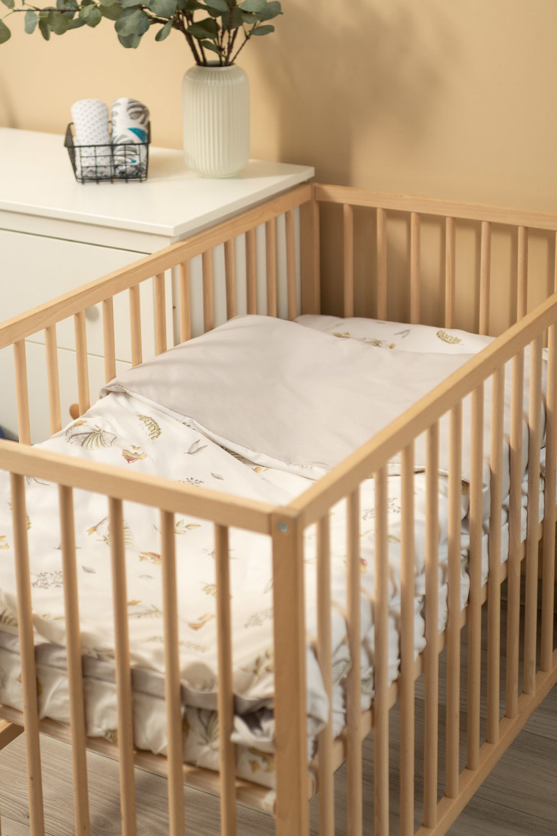 Juego de ropa de cuna en bonito estampado de ganso en colores neutros y totalmente unisex, este juego de funda nórdica, bajera y almohada está realizado en 100% algodón, recomendable para la piel del bebé.