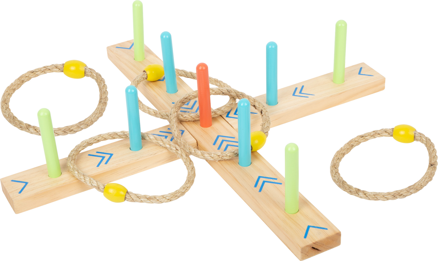 ¿Quién demuestra precisión? En este juego de lanzamiento de anillos hecho con madera certificada FSC® 100%, el objetivo es colocar los anillos trenzados en los nueve alfileres de diferentes colores, cuya puntuación respectiva puede ser determinada incluso sin conocimiento numérico