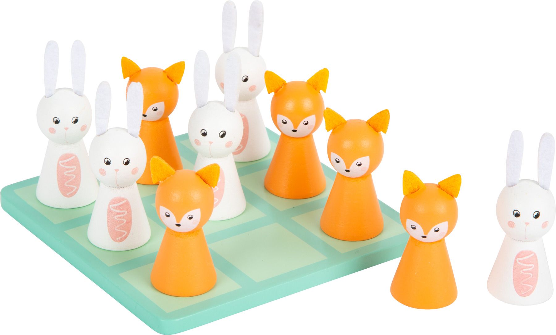 En este juego práctico de estrategia hecho de madera, el conejo y el zorro compiten entre sí para llenar primero una fila de tres en el tablero de juego. Las figuras de animales de color pastel marcan visualmente con sus lindas orejas de fieltro y son absolutamente llamativas en el tablero de juego. ¡Diversión para pequeños y grandes!