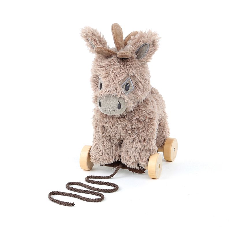 Con una melena y cola de terciopelo suave y rizado y ruedas de madera extraíbles, Norbert es un juguete para tirar y un amigo adorable que se puede abrazar.