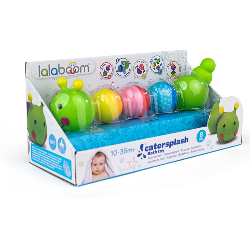 Un juguete de baño educativo y evolutivo con 8 cuentas educativas de diferentes colores y formas que incluyen una cabeza y una cola de oruga para desarrollar las primeras nociones del niño sobre las habilidades motoras finas mientras crea muchas historias en el agua.