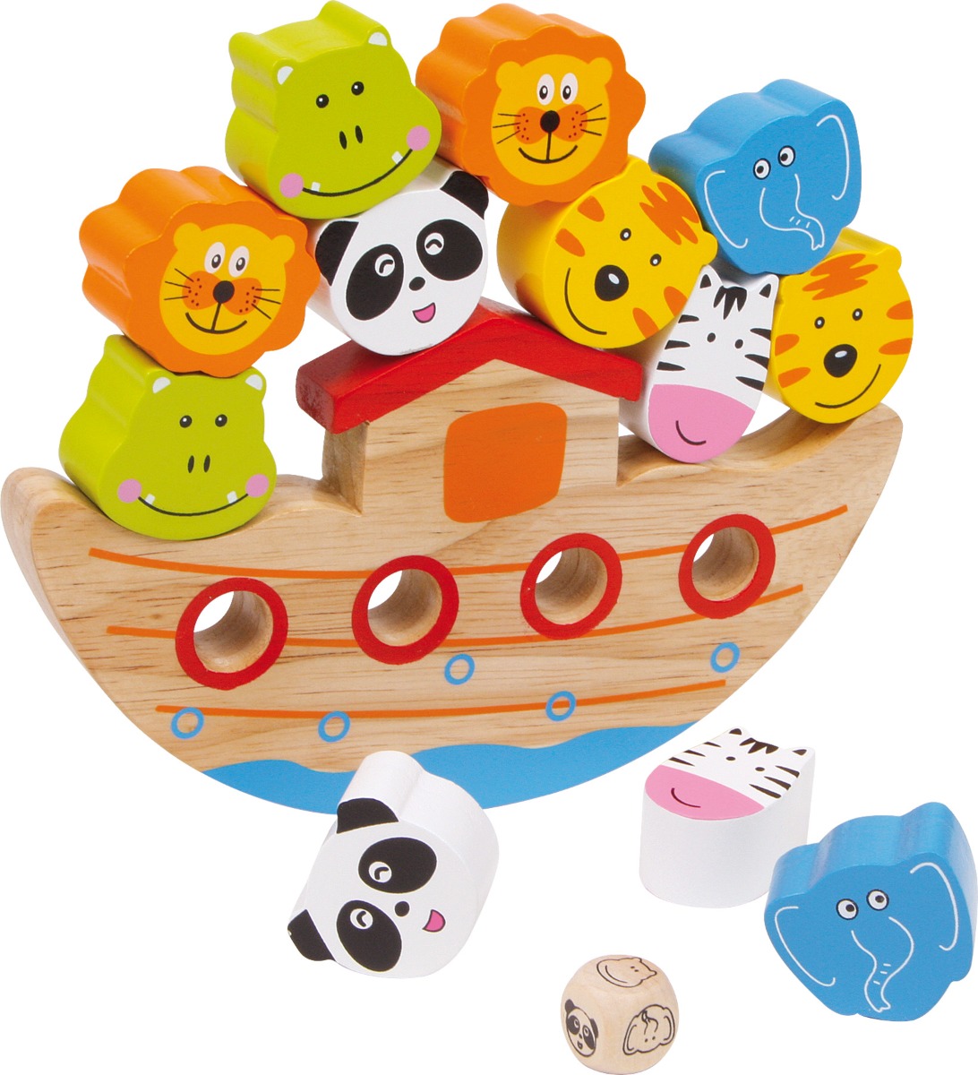 En este juego, se debe tratar poner todas las parejas de animalitos en el arca, ¡Sin que esta pierda el equilibrio! Para hacerlo aún más interesante, será un dado el que decidirá qué animales deben subir conjuntamente al arca. Con este juego, niños y adultos entrenarán la paciencia y la destreza para que ningún pasajero se caiga del arca.