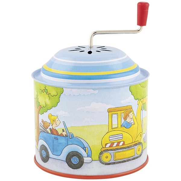 1 caja de metal con manivela para el sonido con dibujo de vehículos