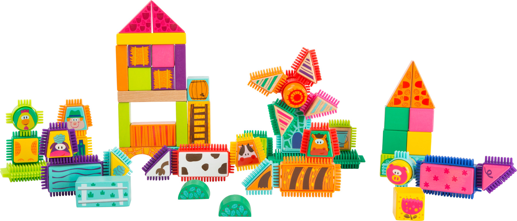 Con motivos impresos de la granja y bloques de construcción de madera natural, se crean edificios creativos e interesantes. Un gran juego de construcción para pequeños constructores.
