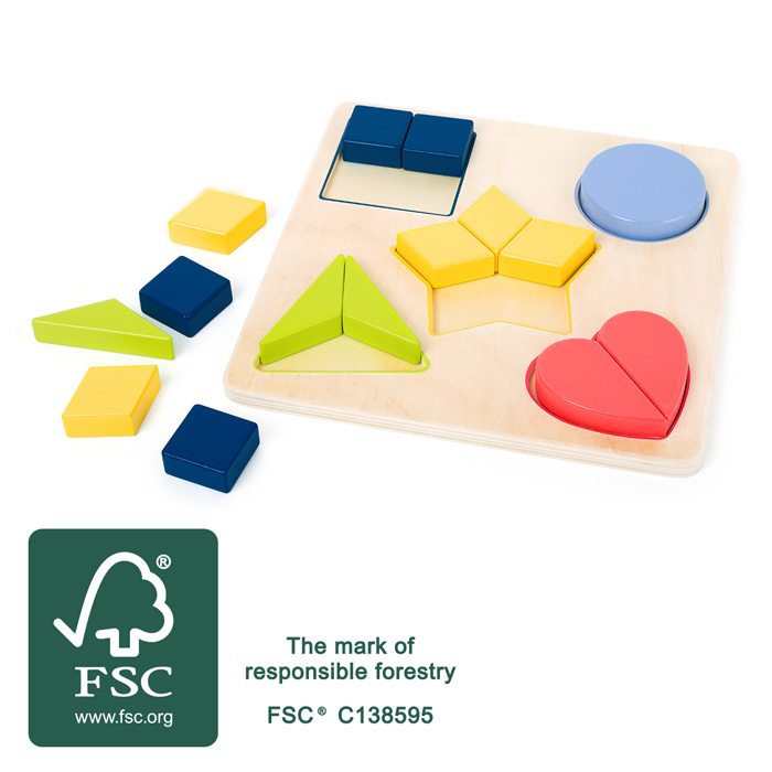 Un divertido juego de aprendizaje. Este colorido juego de combinaciones hecho con madera FSC® 100% certificada, apoya en el aprendizaje de las formas geometrícas. Las lindas formas de madera deben ser colocadas en la forma correcta y entrenan juguetonamente la motricidad, la mente y concentración de los niños.
