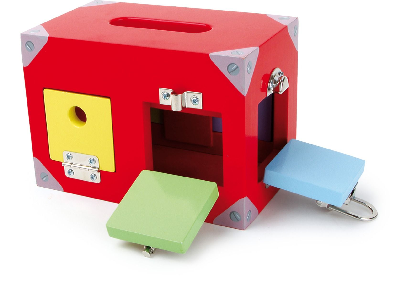 Este juego de motricidad consisten en una caja con elementos coloridos y puertitas. Todas provistas de un seguro.