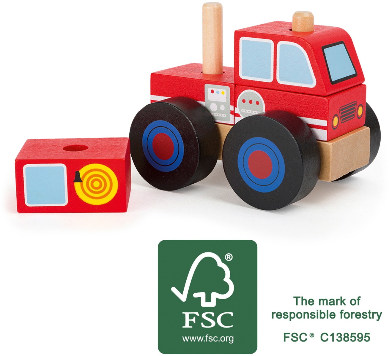 ¿Están todos los bomberos listos para salir? Este camión de bomberos hecho con madera FSC® 100% certificada, primero deben colocarse los cubos de madera en el orden correcto para que así puedan llegar los bomberos a tiempo a su próxima emergencia.