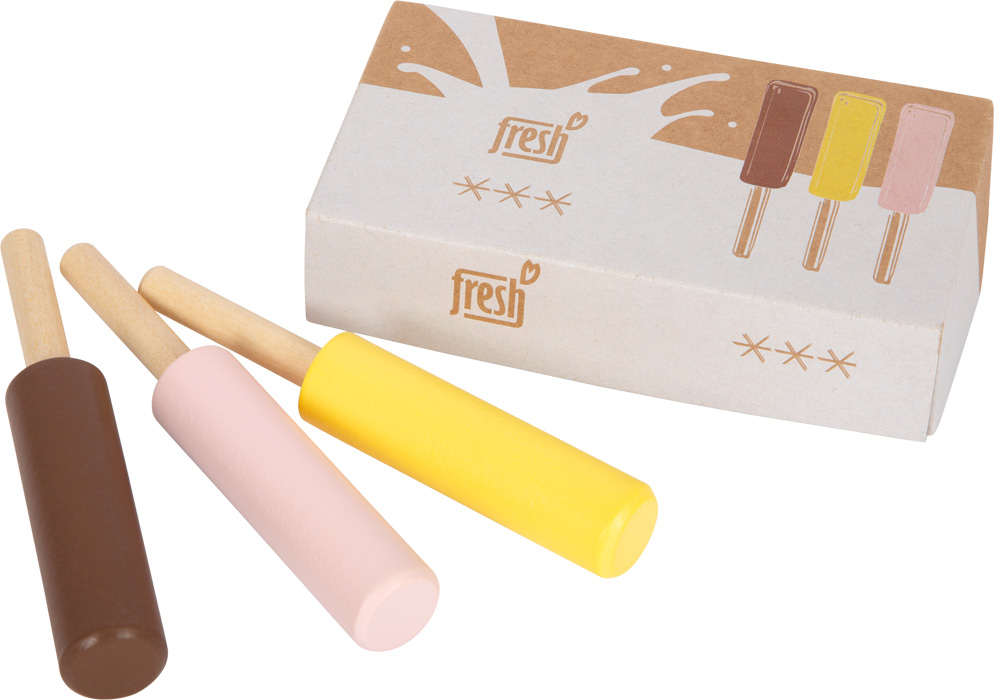 ¡Es la hora del helado! Con este set de 3 paletas de helado en madera, ¡todas las tiendas se convierten en una pequeña heladería! El trío es perfecto para el juego realista en la tienda y la cocina. Los palos de helado de fresa, vainilla y chocolate están cuidadosamente empaquetados en una caja plegable ecológica de cartón natural. Gracias a la sencilla ilustración, incluso los niños pequeños que aún no saben leer pueden entenderlo fácilmente.