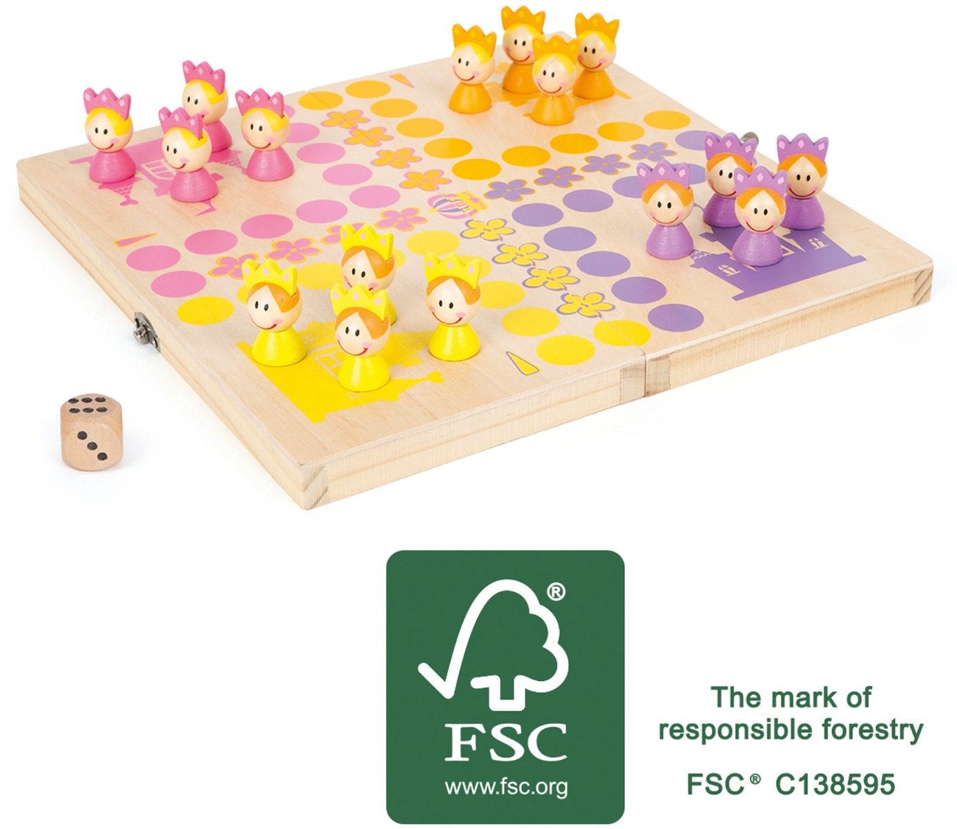 ¿Qué noble princesa logrará llegar primero a la corona? Pintadas en cuatro distintos colores, las princesas 3D de madera FSC® 100%, están esperando para empezar su camino.