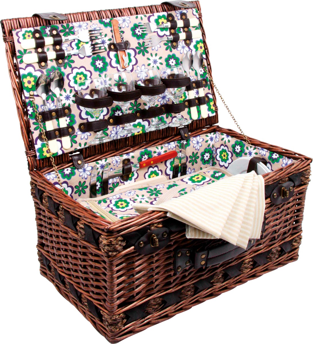 Con esta cesta de mimbre nuestro puesto de mesa en el campo se verá con estilo Las cintas de velcro aseguran cada pieza y una nevera portátil mantiene las comidas y bebidas bien temperadas.