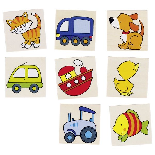 Las reglas: Ahora tenéis que encontrar las parejas. El primer jugador da la vuelta a dos plaquitas de madera, se las enseña a los demás jugadores y las vuelve a dejar en su sitio de nuevo con la imagen hacia abajo. Todos intentan acordarse del lugar de estas plaquitas. El siguiente jugador es el que se encuentre a continuación del anterior siguiendo el sentido de las agujas del reloj. Cuando un jugador da la vuelta a una pareja con las mismas imágenes puede quedársela y dar la vuelta a dos plaquitas más. También podéis jugar con los adultos. ¿Quién recuerda mejor los lugares escondidos de las plaquitas buscadas, los niños o los adultos? Gana quien al final haya juntado el mayor número de parejas de imágenes.
