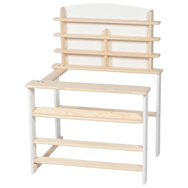 Un clásico de las habitaciones infantiles. En la tienda se fomenta la creatividad y el juego libre y se estimula la imaginación para los juegos de rol. Se imitan y practican las interacciones sociales junto a hermanos y amigos mediante la representación de escenas domésticas cotidianas. El mostrador de madera de conífera natural y los elementos blancos dan a la empresa un aspecto original y moderno.