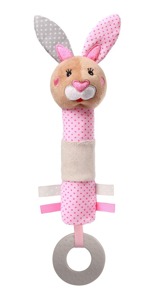 • Desarrolla la coordinación visual, auditiva y motora. • El sonido al apretarlo despierta el interés del bebé y enseña las relaciones causa-efecto. • Ayuda a los bebés a practicar habilidades motoras y manuales (agarrar, pasar de una mano a otra). • El mordedor elástico alivia las encías irritadas durante la dentición.