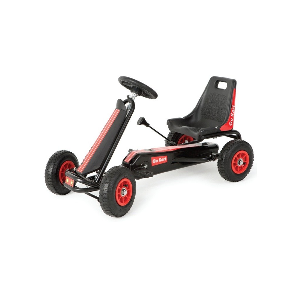 Este coche de pedales está fabricado en acero y recubierto de pintura epoxi. Dispones de cuatro ruedas hinchables E.V.A muy resistentes a la abrasión.