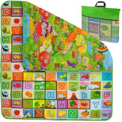 DOBLE CARA: los colores vivos y las aplicaciones atraen la atención del niño y lo alientan a usarlos repetidamente; por un lado hay dibujos de cuentos de hadas de varios personajes, animales, frutas y hongos, y por el otro lado hay números y letras que permitirán, entre otras cosas, aprender números, palabras y colores; la colchoneta cumple funciones educativas y repercute en el desarrollo del niño.