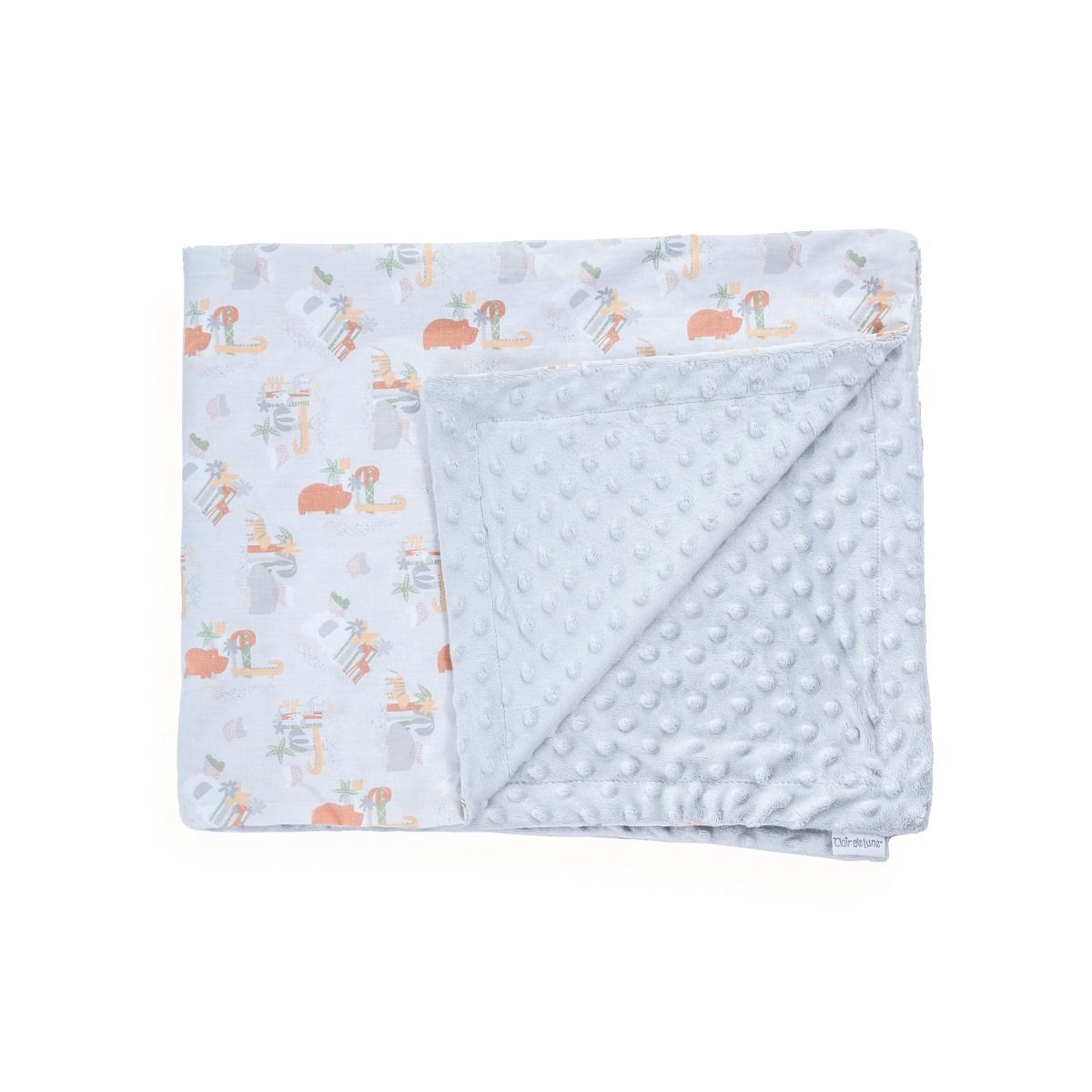Hecha con dos capas, esta manta súper linda presenta un estampado de algodón Safari en un lado y un lujoso tejido Dimple gris en el otro, ahhh perfecto para acurrucarse.