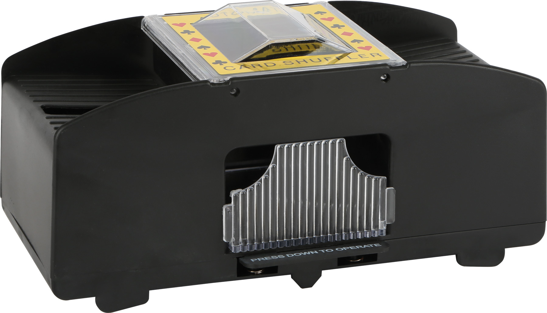 Barajador eléctrico de plástico con dos depósitos para colocar las cartas. Se retiran barajadas por el depósito de al medio.