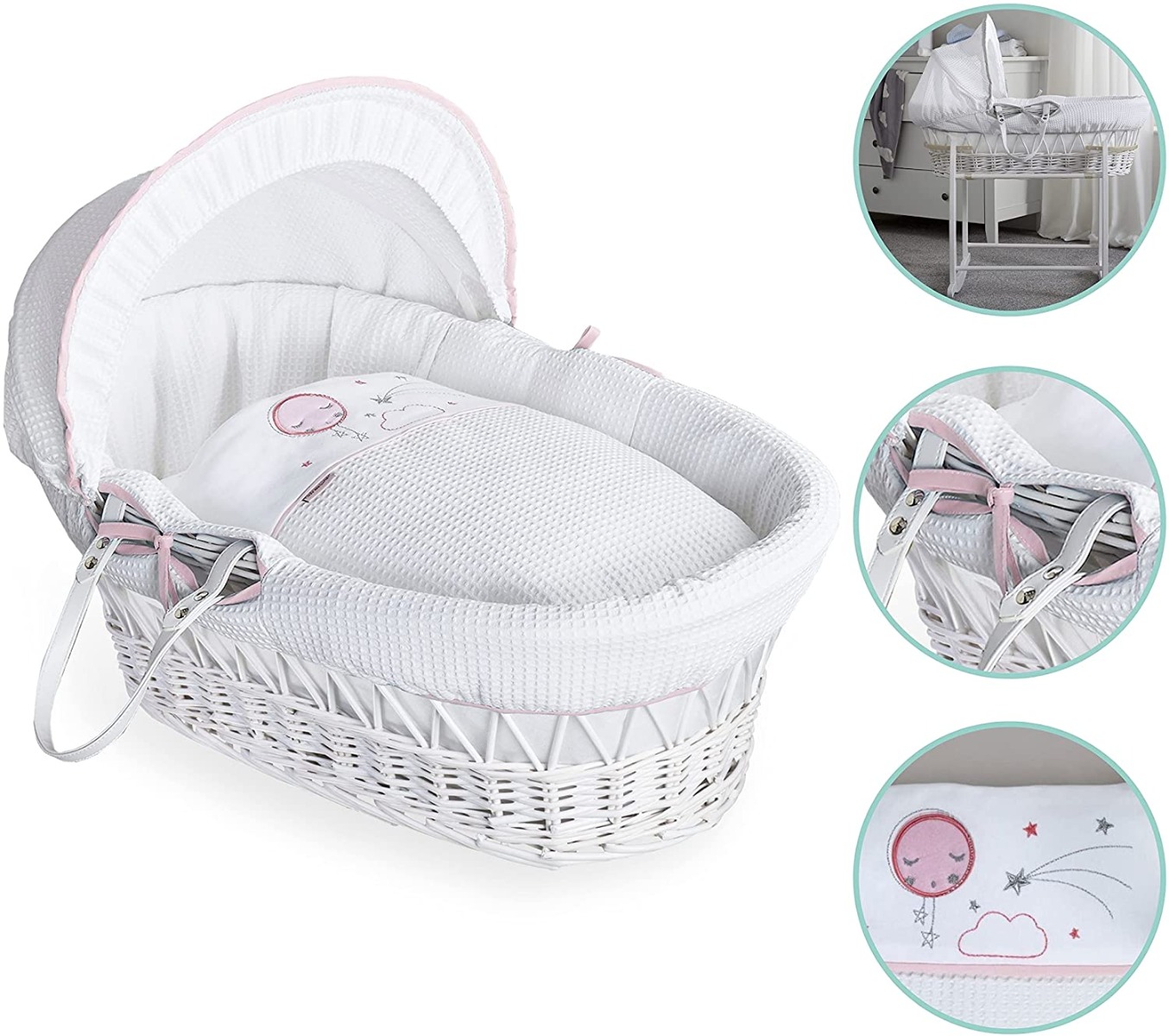 Moisés de bebé realizado en mimbre lacado en blanco, está realizado a mano y vestido con vestiduras con bordado a mano en Inglaterra por la marca Clair de Lune. Este serón de bebé viene completo con capota, colchón, edredón superior y dos asas y presenta unos preciosos bordados con mótivo de luna y disponible en tres colores , azul, rosa o gris. Las vestiduras con suaves telas de 100% algodón y relieve al tacto son totalmente transpirables por lo que son ideales para usar durante todo el año.
