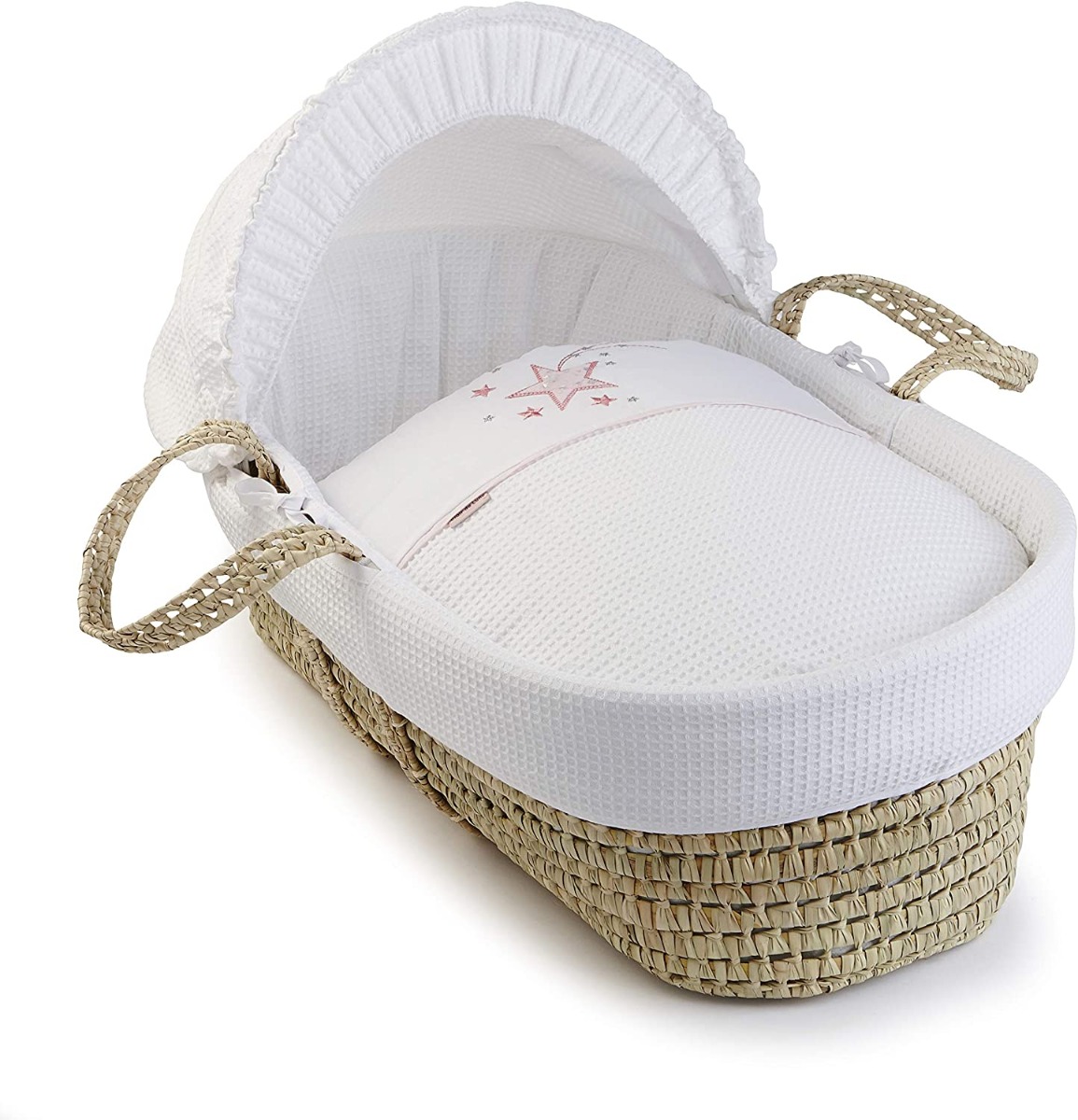 Este moises de palma para bebés viene con unas boradas a mano en Uk por Clair de Lune. Las vestiduras son de algodón ideales para los primeros sueños de cualquier bebé y son las clásicas vestiduras Waffle blanca en este caso con un bordado de una estrella.
