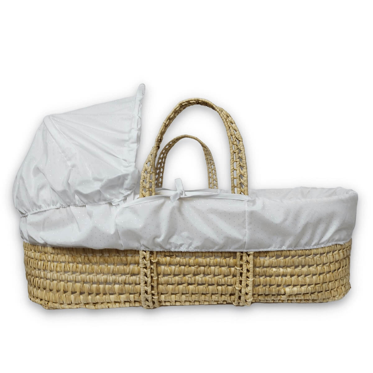Precioso moisés en color blanco con detalles de lunares en su vestidura atemporal.