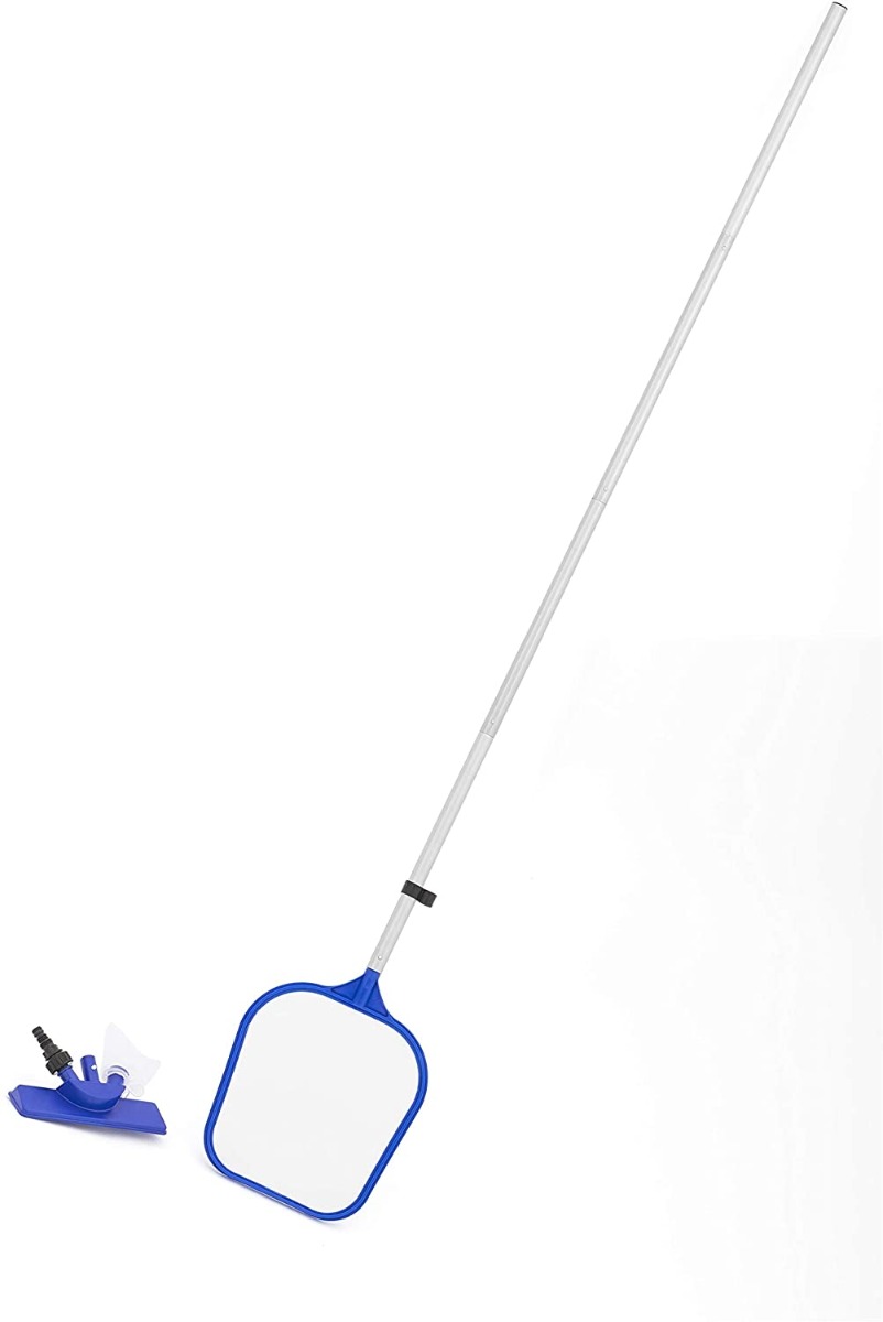 PALO CON EXTREMOS INTERCAMBIABLES - incluido en el conjunto palo ajustable que actúa como mango. Le podemos acoplar uno de los dos extremos: red para recoger la suciedad, gracias a la cual, antes de entrar en el agua, se puede limpiar de cualquier contaminante que flote en la superficie, y punta de aspirador, que conectada a una manguera de jardín , crea un vacío, haciendo que el agua gire. Con su ayuda recogerás todos los escombros del fondo de la piscina en una pequeña malla adherida a la punta.