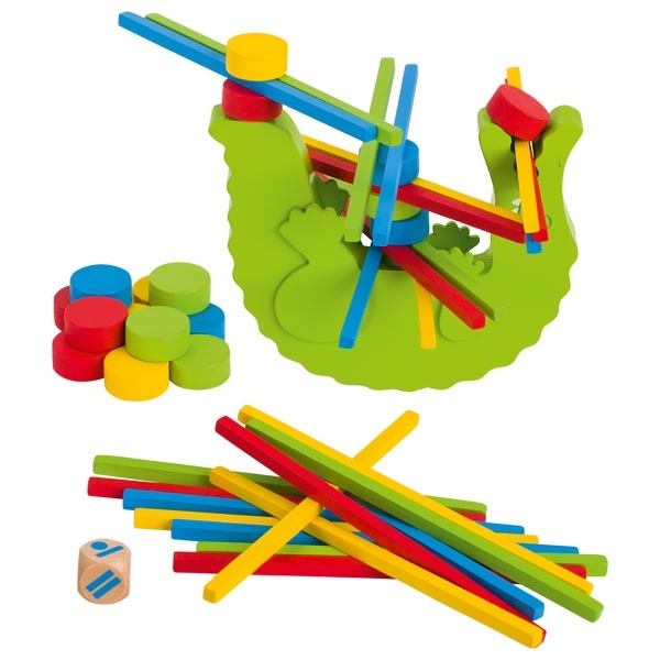 Objetivo del juego: Los palitos y las fichas de madera tienen que colocarse con mucha habilidad sobre el cocodrilo sin que pierdan el equilibrio.