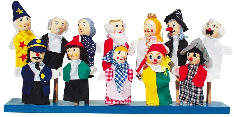 Este set incluye 12 marionetas de dedo hechas de madera y tela que se pegan a los dedos.